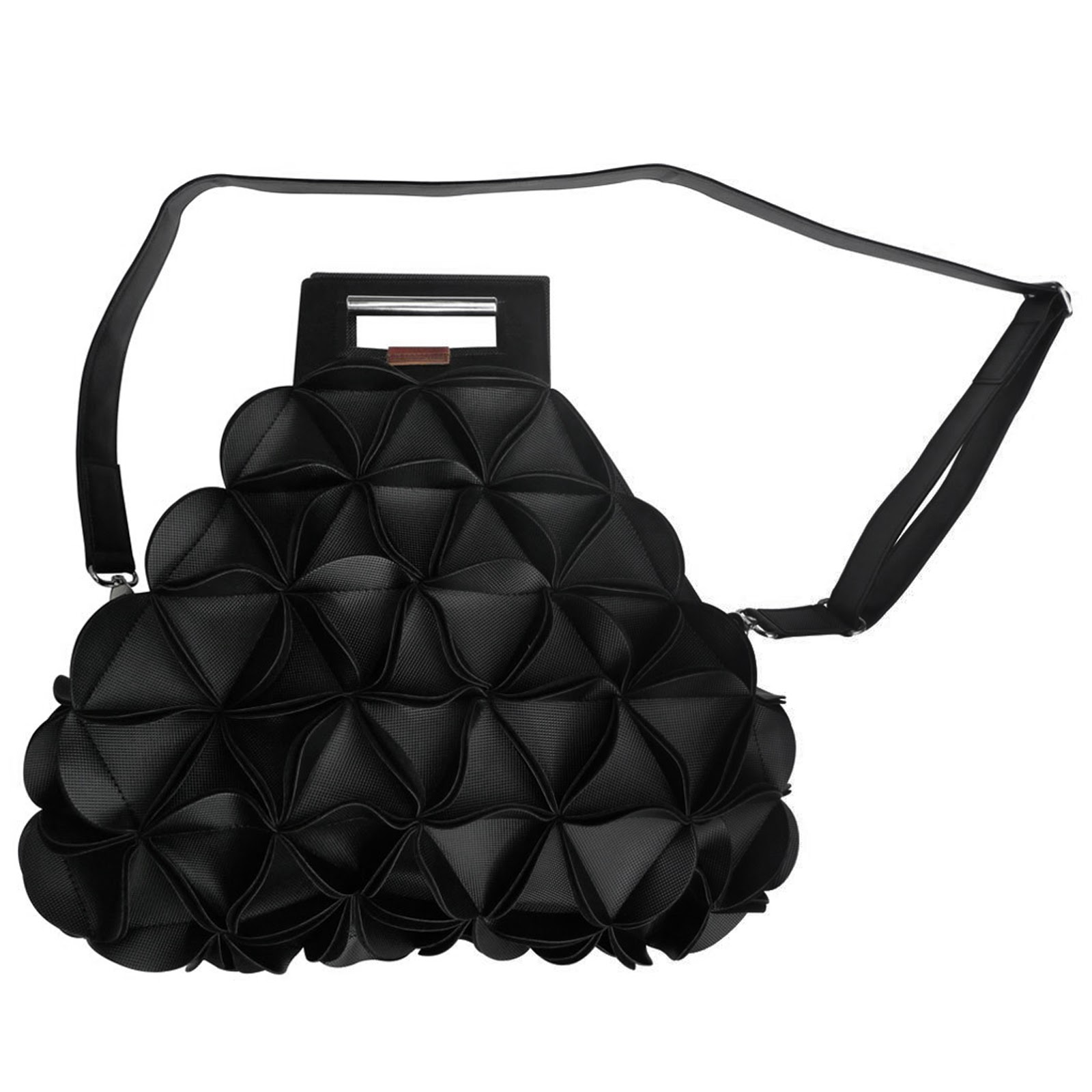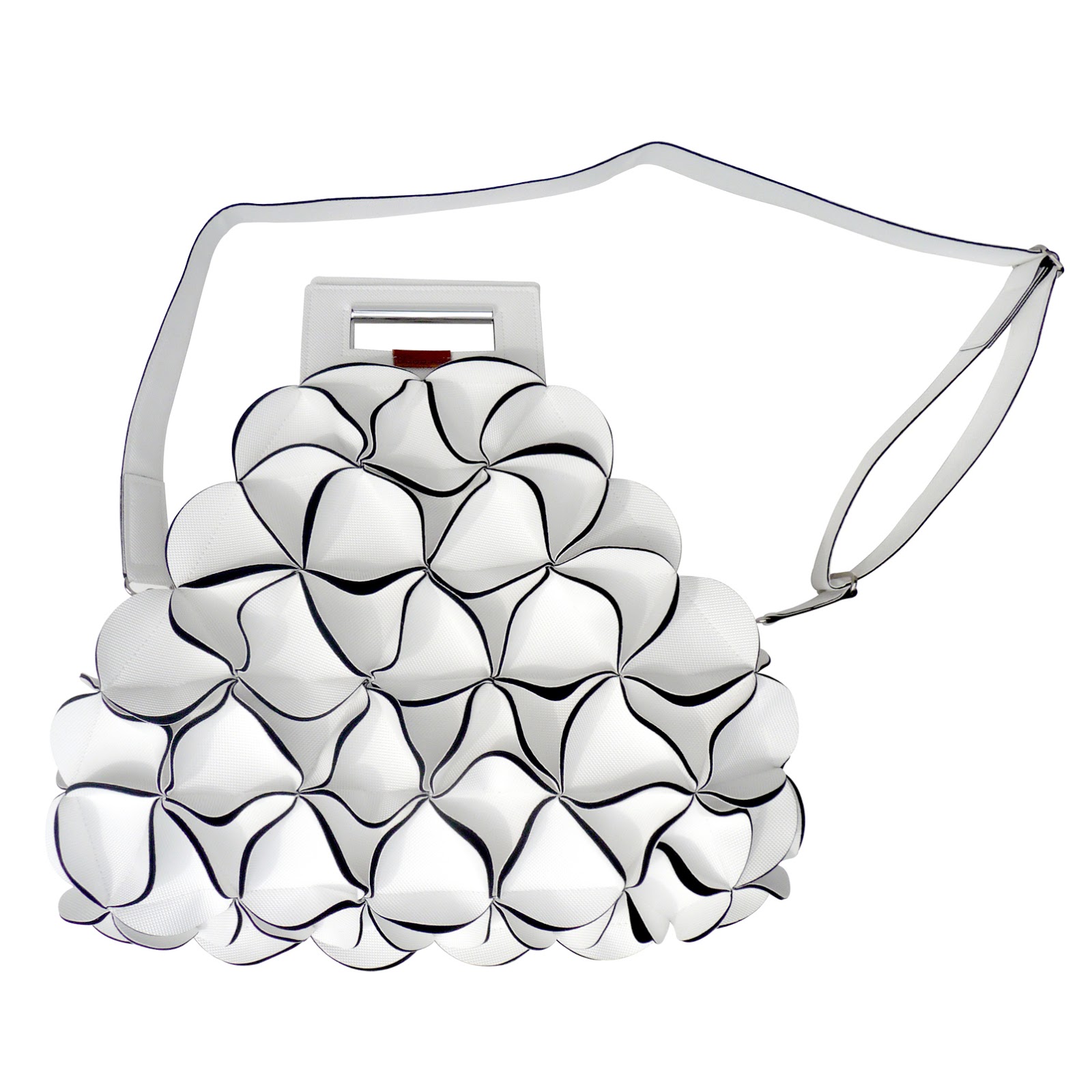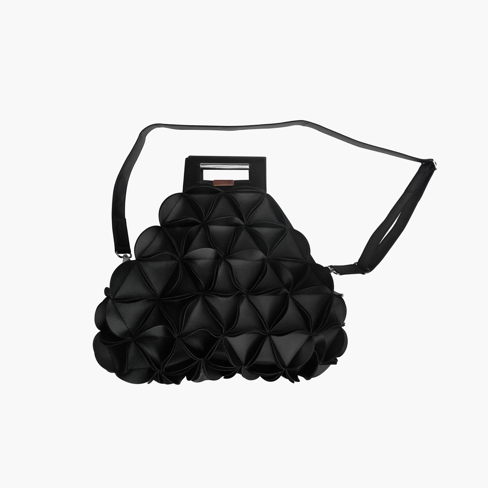 從邊角布料延伸創新的思維。這個優秀的獲獎設計是以再次利用的環保概念出發,將角邊布料以三角形的構造縫製,提拉出獨特的3D質感,如同花苞香豔綻放。